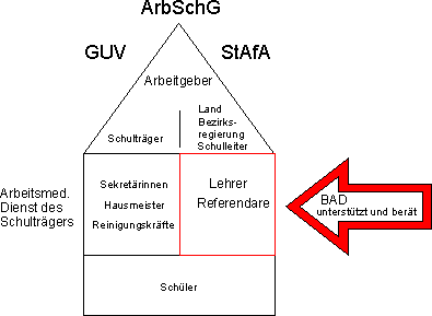 Allerdings ist der BAD auch keine Beratungsstelle für Schwerbehinderungen oder Stundenermäßigungen. Wer sich für die Aufgaben des arbeitsmedizinischen Dienstes in der Schule interessiert, sollte sich das folgende Diagramm anschauen, das die Stellung des BAD im Schulbetrieb verdeutlicht: